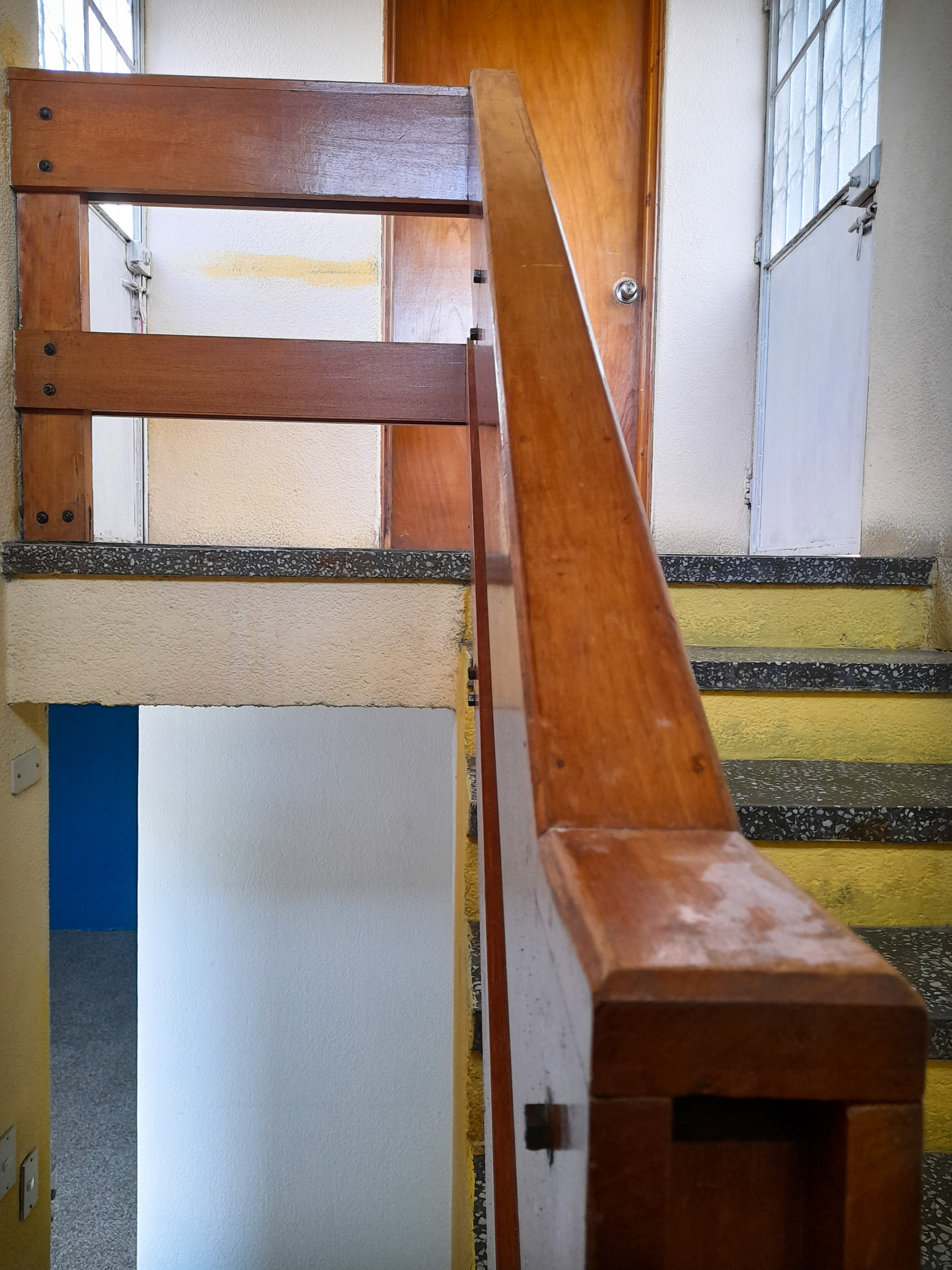 - Las gradas están hechas de granito obscuro con barandas de madera